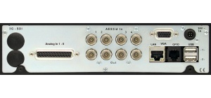 8-ch digital AES3id I/O (BNC), 8-ch analog input (Sub-D), Ethernet, VGA, 2 x USB 2.0, GPIO, 24 V DC connectors.